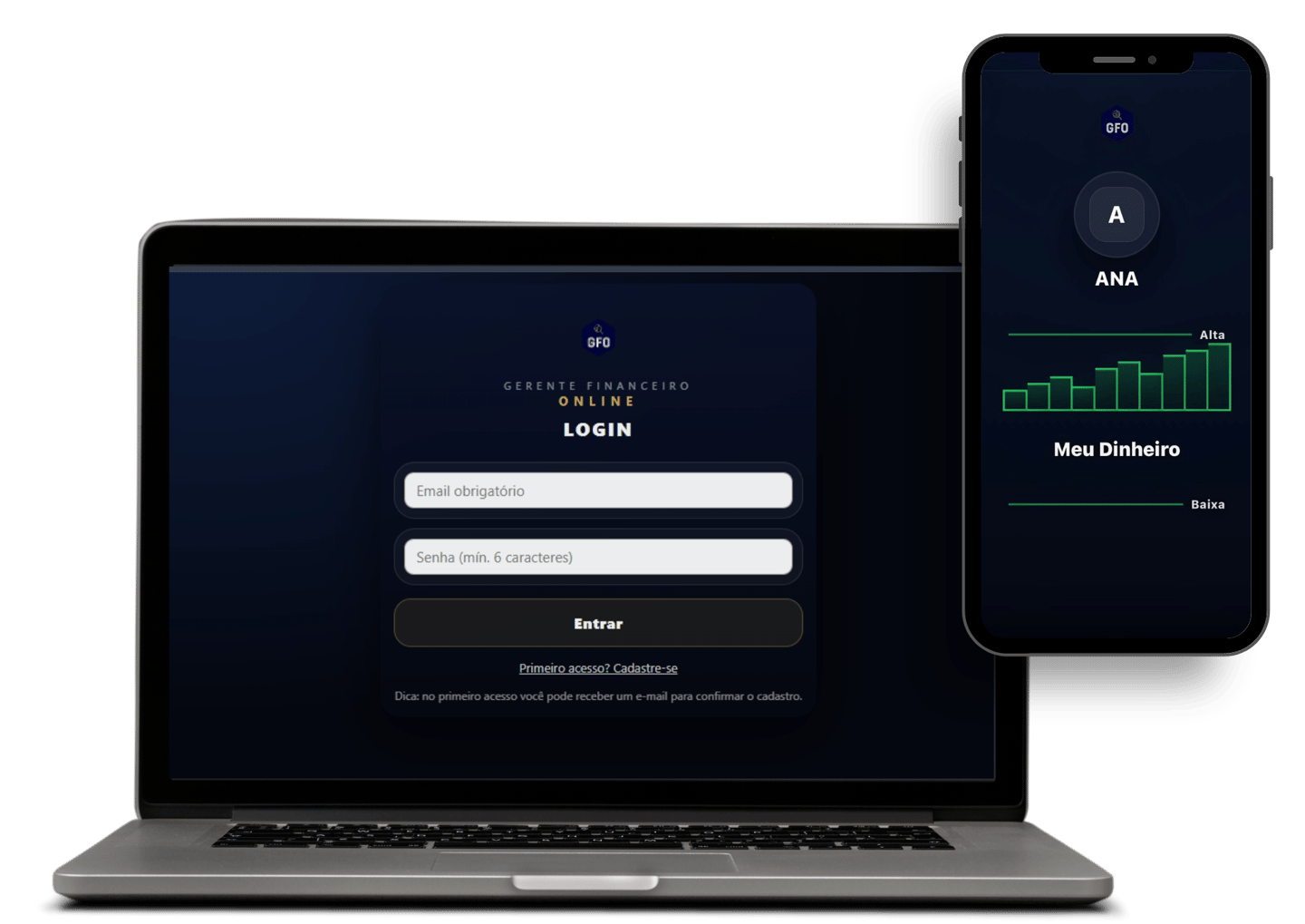 O GFO - Gestor Financeiro Online é seu gestor financeiro online que organiza seu financeiro e te mostra, com clareza, quanto entra, quanto sai e o que sobra.